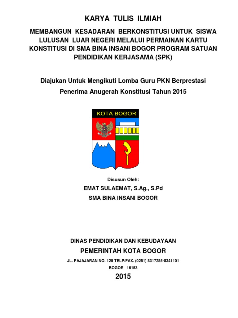Untuk anda yang kebetulan lupa atau belum mengetahui mengenai aturan pembuatan karya ilmiah, di artikel kali ini saya akan coba uraikan tentang aturan penulisan karya ilmiah terutama untuk format margin, kertas, font sehingga karya ilmiah yang anda buat sesuai dengan aturan formal yang telah ditetapkan. Logo sekolah (2) form abstrak. Namun beberapa poin penting dalam format penulisan dimaksud bisa dipakai sebagai acuan dalam penulisan karya ilmiah selain skripsi, seperti paper/makalah, artikel dalam jurnal ilmiah, dan lain sebagainya. Judul tulisan harus spesifik, ringkas dan jelas, tidak. Huruf pertama setiap kata dimulai dengan huruf besar (title case) kecuali kata penghubung dan kata depan, tanpa diakhiri titik. Lihat cara format contoh cover karya tulis ilmiah ini. Demikian panduan cara mengatur margin makalah yang benar ukuran 4433 cm beserta standar lainnya. Tandai sebagai konten tidak pantas. Judul penelitian, bidang dan kategori lomba, nama dan instansi pengusul, logo sekolah dan logo lipi. Format penulisan karya tulis ilmiah skripsi, paper/makalah, laporan penelitian, dan lain sebagainya, memiliki format penulisan tertentu untuk bisa disebut sebagai sebuah karya ilmiah. Unduh sebagai doc, pdf, txt atau baca online dari scribd. Contoh karya tulis ujian penyesuaian kenaikan pangkat. Bentuk buku dan non buku yang dipublikasikan