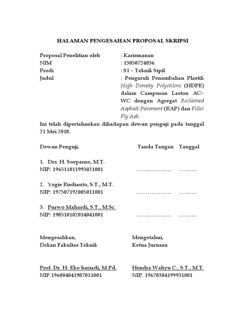 Keluarga mahasiswa teknik sipil progdi teknik sipil fakultas teknik universitas muhammadiyah surakarta jl. Sebelum membuat lembar pengesahan, pastikan terlebih dahulu struktur penyusunnya. Faktorfaktor yang mempengaruhi kejadian karies gigi pada murid sdn. Dalam proposal lengkap tersebut juga telah disisipkan; Cover dan lembar pengesahan proposal penelitian & skripsi.